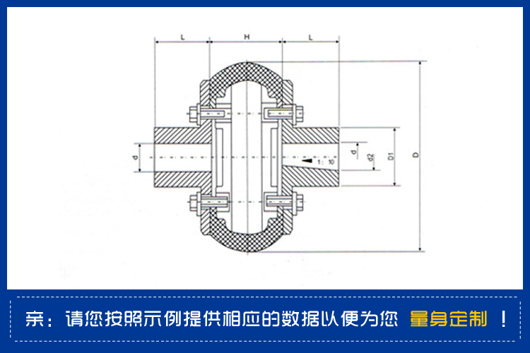 輪胎連軸器的橡膠元件(輪胎)與金屬壓板硫化粘結(jié)在一起,裝配時用螺栓直接與兩半連軸器聯(lián)結(jié)
