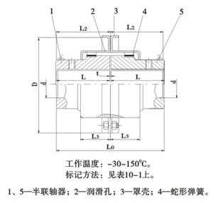 | 型號(hào) | 公稱(chēng)轉(zhuǎn)矩Tn KN.m | 許用轉(zhuǎn)速(n) r/min | 軸孔直徑 d | 軸孔長(zhǎng)度 L | 總長(zhǎng)度 L0 | L2 | L3 | D | 間隙 t | 重量 kg | 潤(rùn)滑油 kg | 許用位移量 | ||