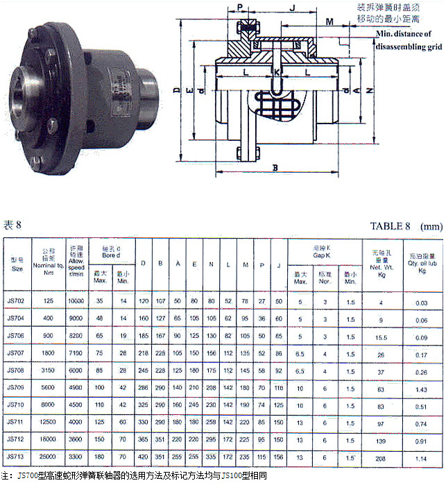 1、JS700系列高速蛇形彈簧聯(lián)軸器結(jié)構(gòu)簡單,裝拆方便。整機(jī)零件少,體積小,重量輕,被設(shè)計(jì)成梯形截面的彈簧片與梯形齒槽的吻合尤為方便,緊密,從而使裝拆,維護(hù)比一般聯(lián)軸器簡便。