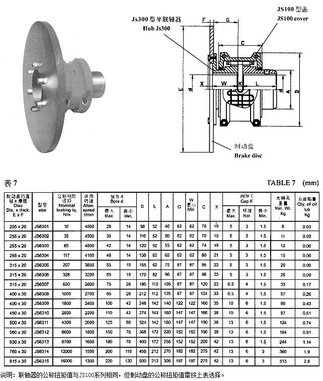 JS6300系列制動盤式蛇形彈簧聯(lián)軸器是一種結構先進的金屬彈性聯(lián)軸器。它以蛇形彈簧片軸向嵌入兩半聯(lián)軸器的齒槽內,來實現(xiàn)原動機與工作機的聯(lián)接,由于簧片的特殊性能,從而很大程度上避免了原動機與工作機的共振現(xiàn)象,使用壽命遠高于非金屬彈性元件聯(lián)軸器;簧片所接觸的齒面為弧形,接觸面的大小隨傳遞扭矩的大小而變化,因而它能承受大的載荷變動量,經測定其短時超載能力為額定扭矩的2~3倍,傳動效率達99.5%,運行可靠;且蛇形彈簧聯(lián)軸器的結構簡單,裝拆方便,允許有較大的安裝偏差,適用于沖擊式的碎煤機、碎石機、曲柄往復運動、礦山、重型機械、減速機等